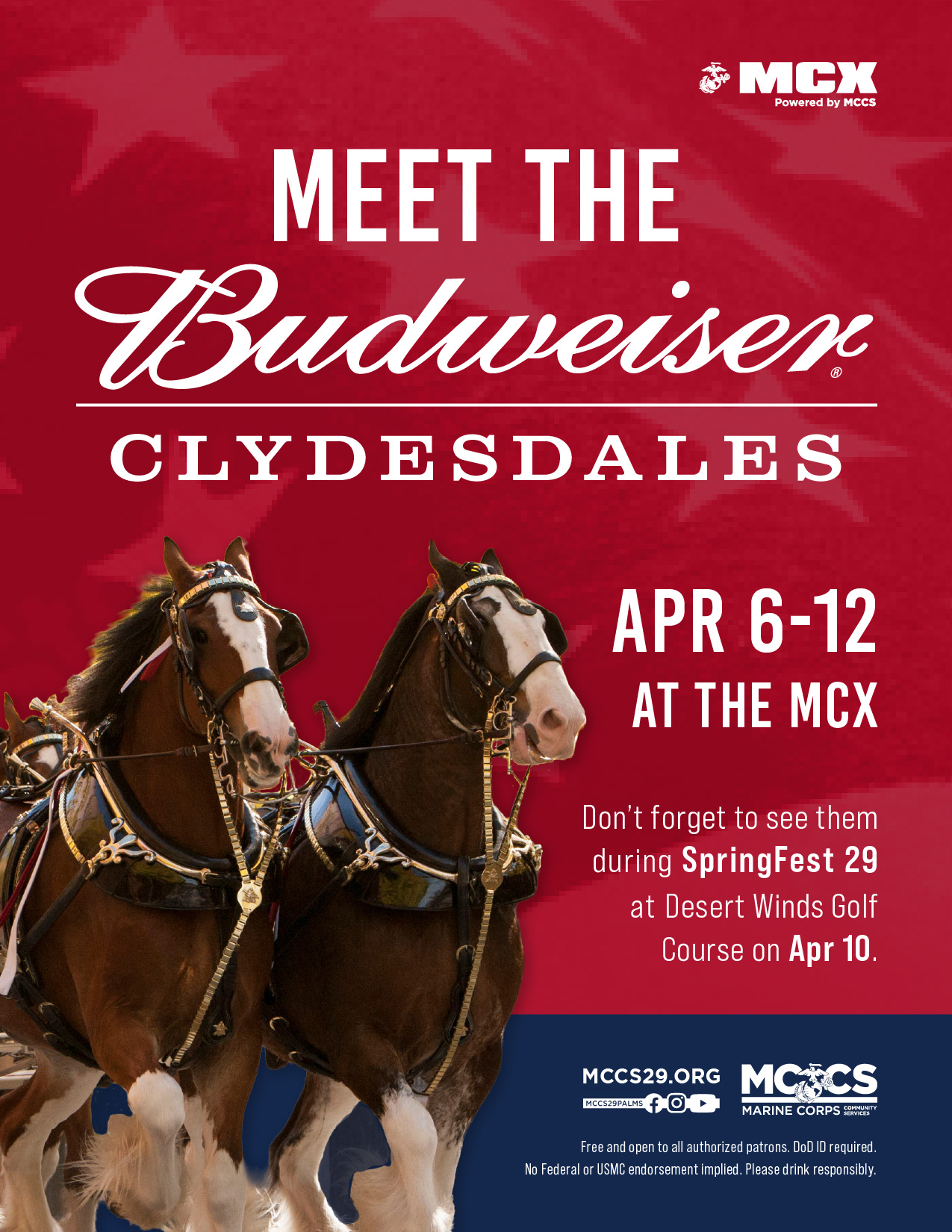 From the Prohibition era to Super Bowl commercials, there is nothing more iconic in Budweiser’s history than its team of Clydesdale horses. See them at the MCX before their appearance at SpringFest 29 at the Desert Winds Golf Course on April 10.