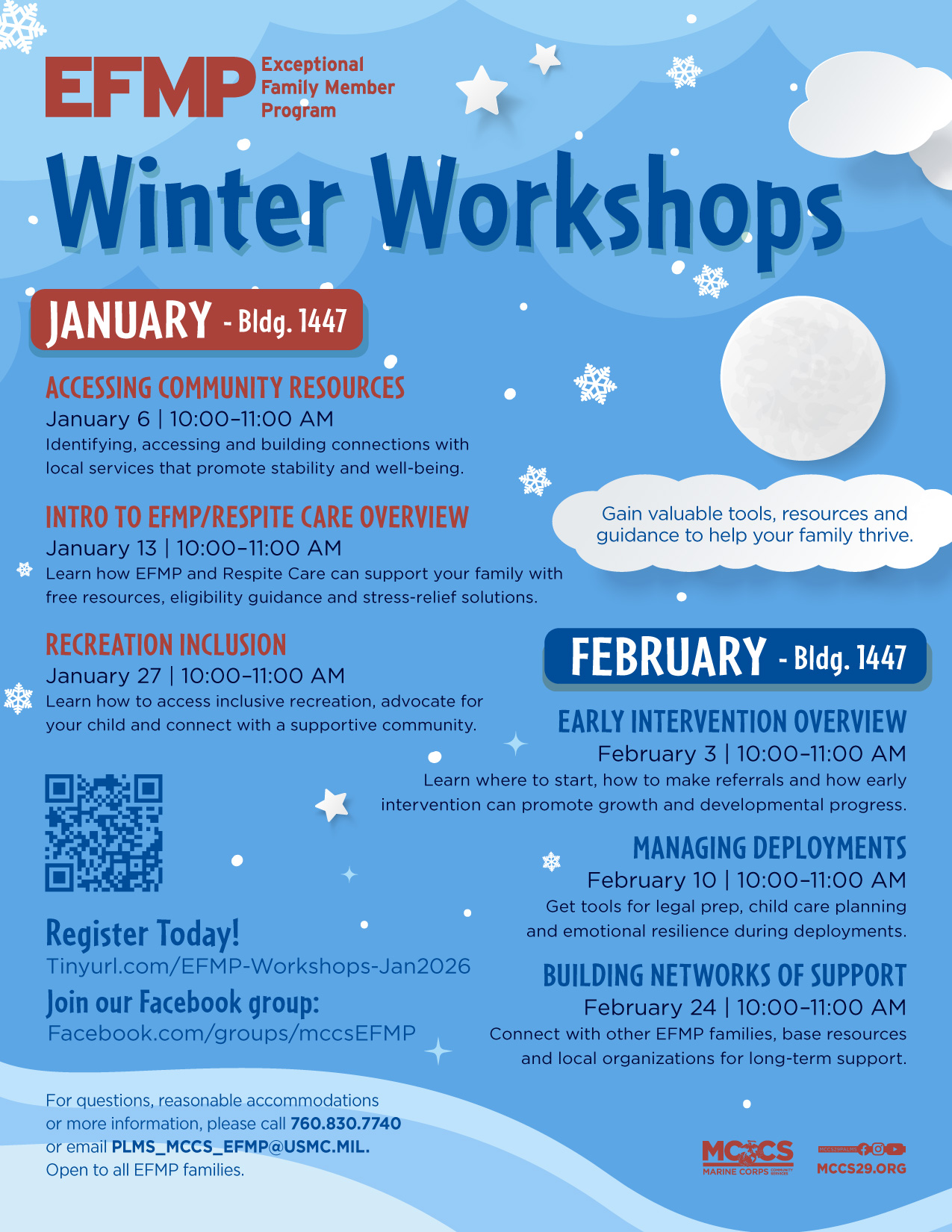 Join our Facebook group for the latest updates and program information: facebook.com/groups/mccsEFMP